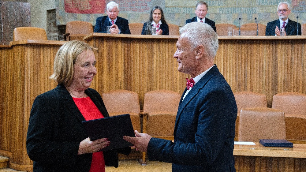 Snímek z předávání cen minulého ročníku na květnovém Valném shromáždění Učené společnosti v Karolinu. Předseda Učené společnosti Martin Loebl předává cenu učitelce dějepisu na Základní fakultní škole profesora Otokara Chlupa v Praze Petře Rajtrové.