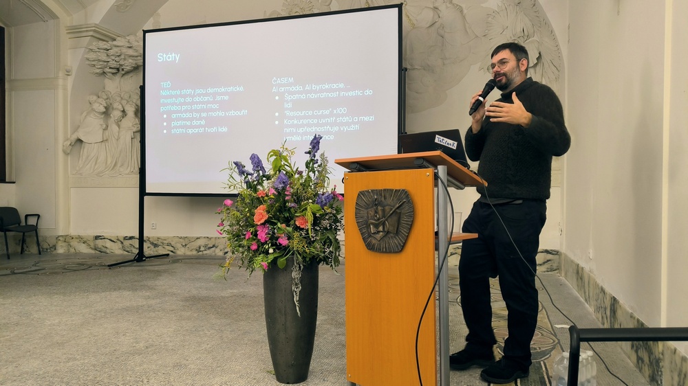 O příležitostech a rizicích spojených s umělou inteligencí diskutovali v úterý 11. listopadu Jan Kulveit (Centrum pro teoretická studia UK a AV ČR), právník Zbyněk Loebl (Of Counsel PRK Partners, fellow NCTDR, člen Boardu ICODR), Jakub Nešetřil (Matika Česku, podnikatel v IT) a Marek Orko Vácha (Ústav etiky a humanitních studií 3. LF UK).
